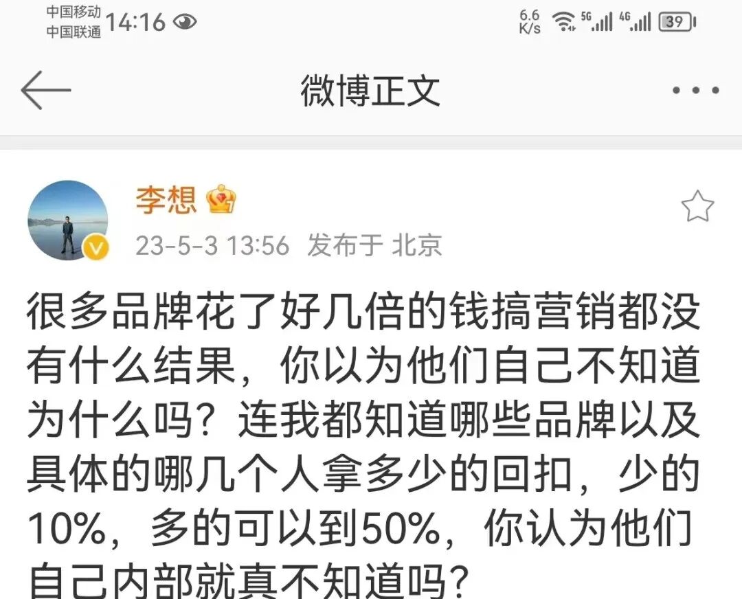 近日,理想汽车创始人李想连发4条微博回应“理想全网砸钱营销”。其中一条微博竟无意中曝出车圈部分品牌大比例拿回扣的营销乱象:有品牌及具体的几个人,吃回扣少则10%,多的可以达到50%。不过,该微博在发布不久后便被删除。