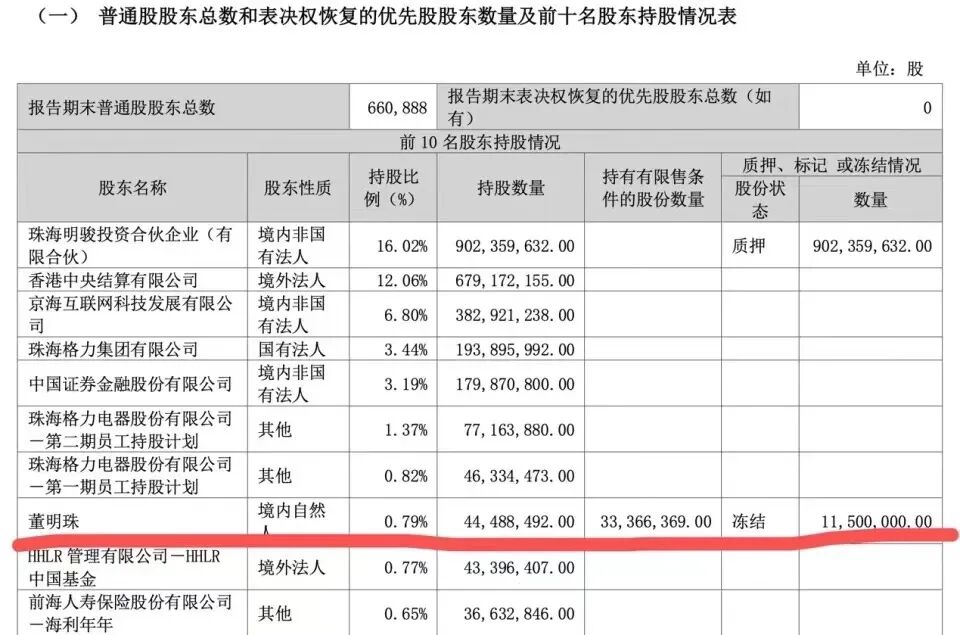此外,在格力电器发布的2023年一季报中,董明珠名下1150万股股份处于冻结状态,占据董明珠个人持股比例34.45%。截至发稿,格力电器并未回应冻结原因。(腾讯财经、第一财经)