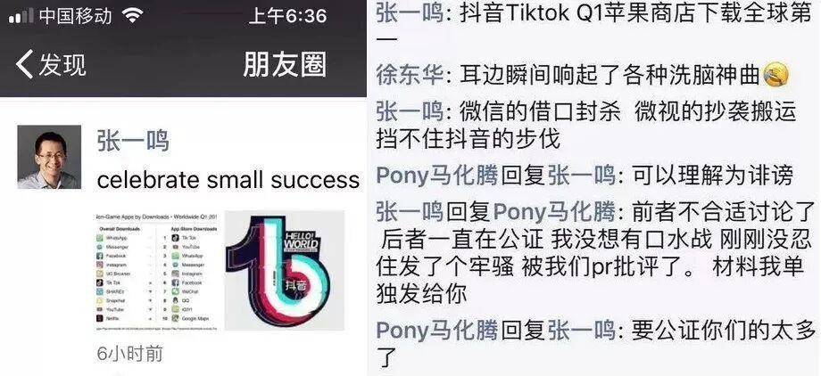 2018年5月5日,张一鸣在庆祝抖音成功的朋友圈里发文称:“微信的借口封禁,微视的抄袭搬运,挡不住抖音的步伐。”马化腾看到朋友圈后回复张一鸣:“可以理解为诽谤。”
