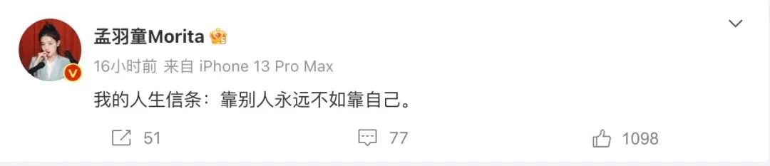 5月9日,孟羽童在微博发文称:“我的人生信条:靠别人永远不如靠自己。”目前,该微博已被删除。(红星新闻)