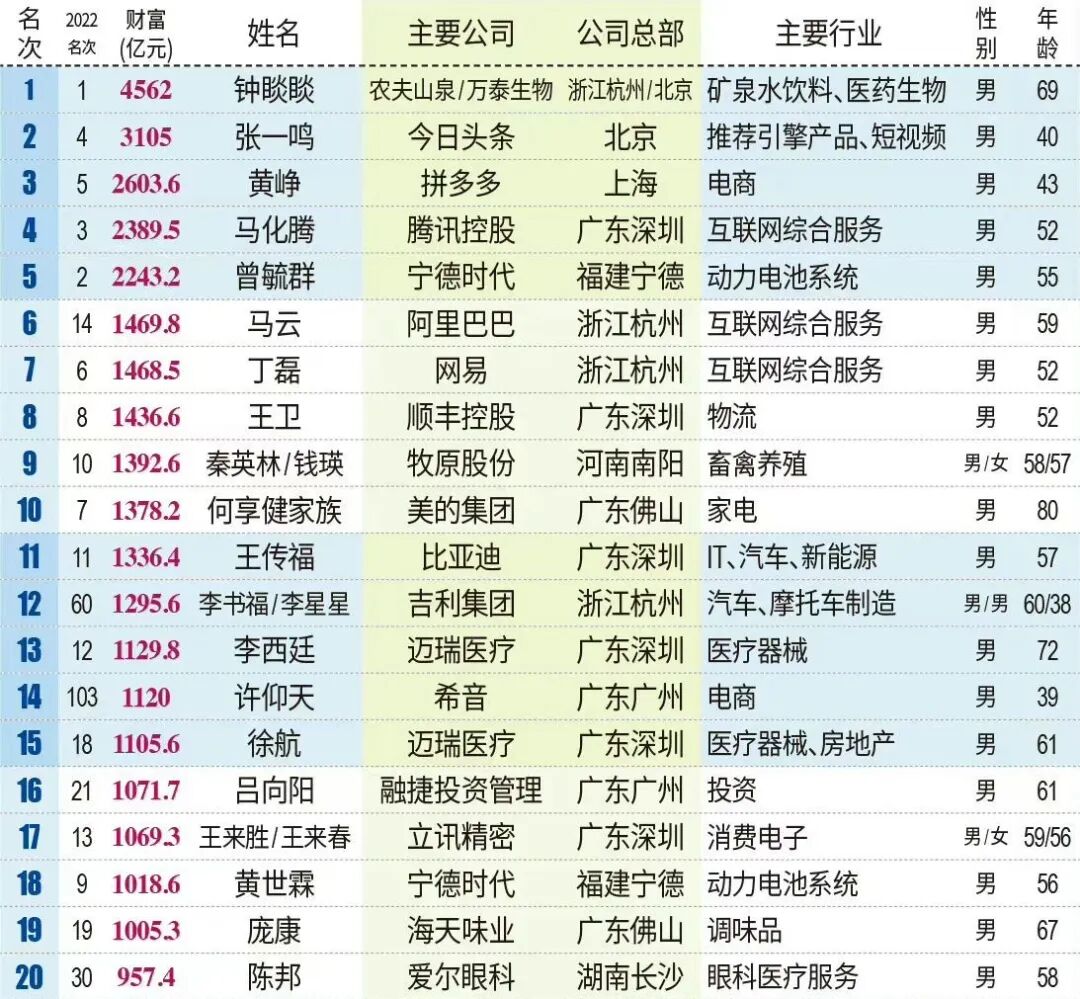 钟睒睒连续三年登榜首富,比亚迪王传福成汽车行业首富