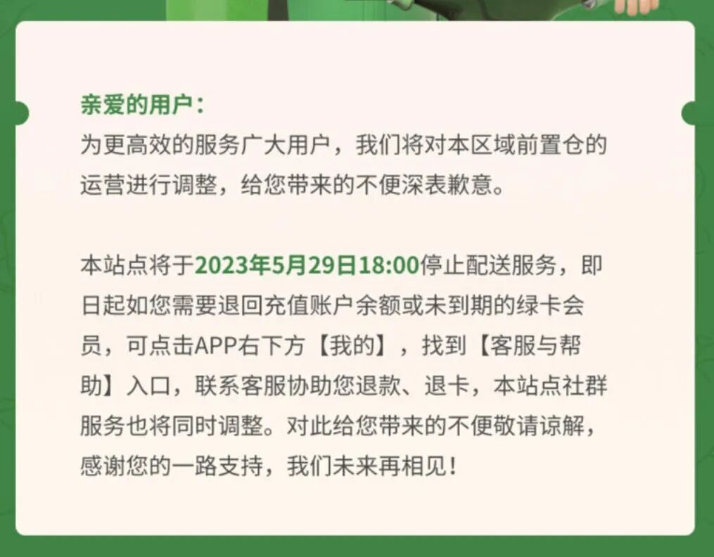 5月22日消息,叮咚买菜发布公告称,“为了更高效地服务广大用户,将对本区域前置仓的运营进行调整”。将于 5 月 29 日 18:00 起停止川渝站点的配送服务。用户可以点击 App 右下方“我的”,找到“客服与帮助”入口,联系客服协助退款、退卡。