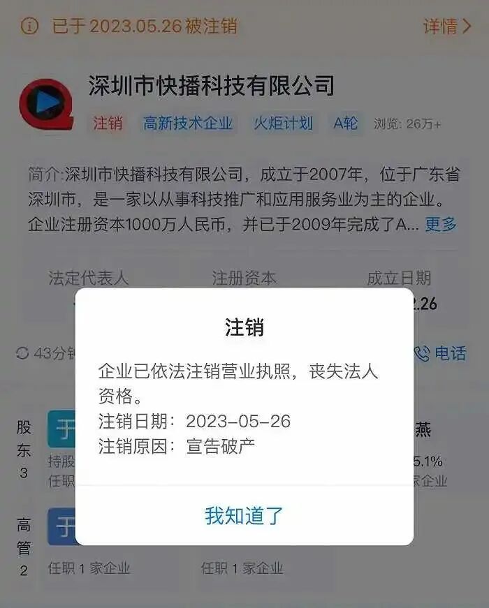 5月30日消息,近日,深圳市快播科技有限公司发生工商变更,企业经营状态由吊销未注销变更为注销,注销原因为宣告破产,曾经风靡全国的视频播放器迎来了最终结局。对外投资信息显示,该公司持有北京快播科技有限公司、深圳市快玩科技有限公司等共6家公司股份,目前,6家公司均处于注销或吊销未注销状态。