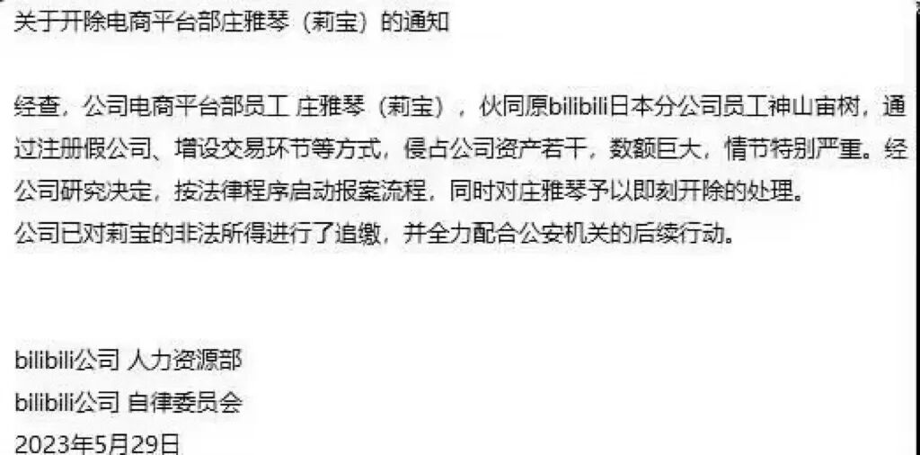 日前,网传的一份B站“关于开除电商平台部庄雅琴(莉宝)的通知”内部邮件截图显示: