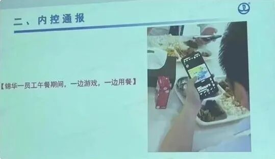 据悉,这是公司内部的通报,某员工在中午食堂用餐的时候看手机,顺带玩一下游戏,然后被人力行政看到了,给拍下来了。这事儿还没完,公司把这个事情放大了,做成了PPT在内部进行通报。(快科技)