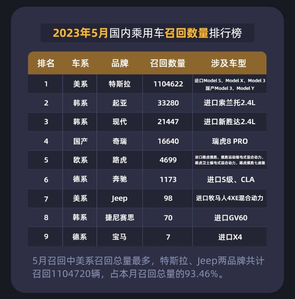 5月国内汽车召回数量排名:美系特斯拉遥遥领先