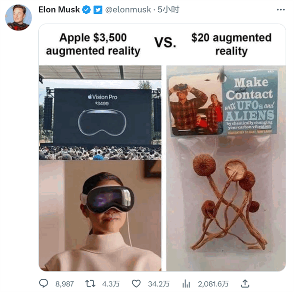 马斯克嘲讽苹果VisionPro头显:花3500美元买它,不如花20美元买包致幻蘑菇