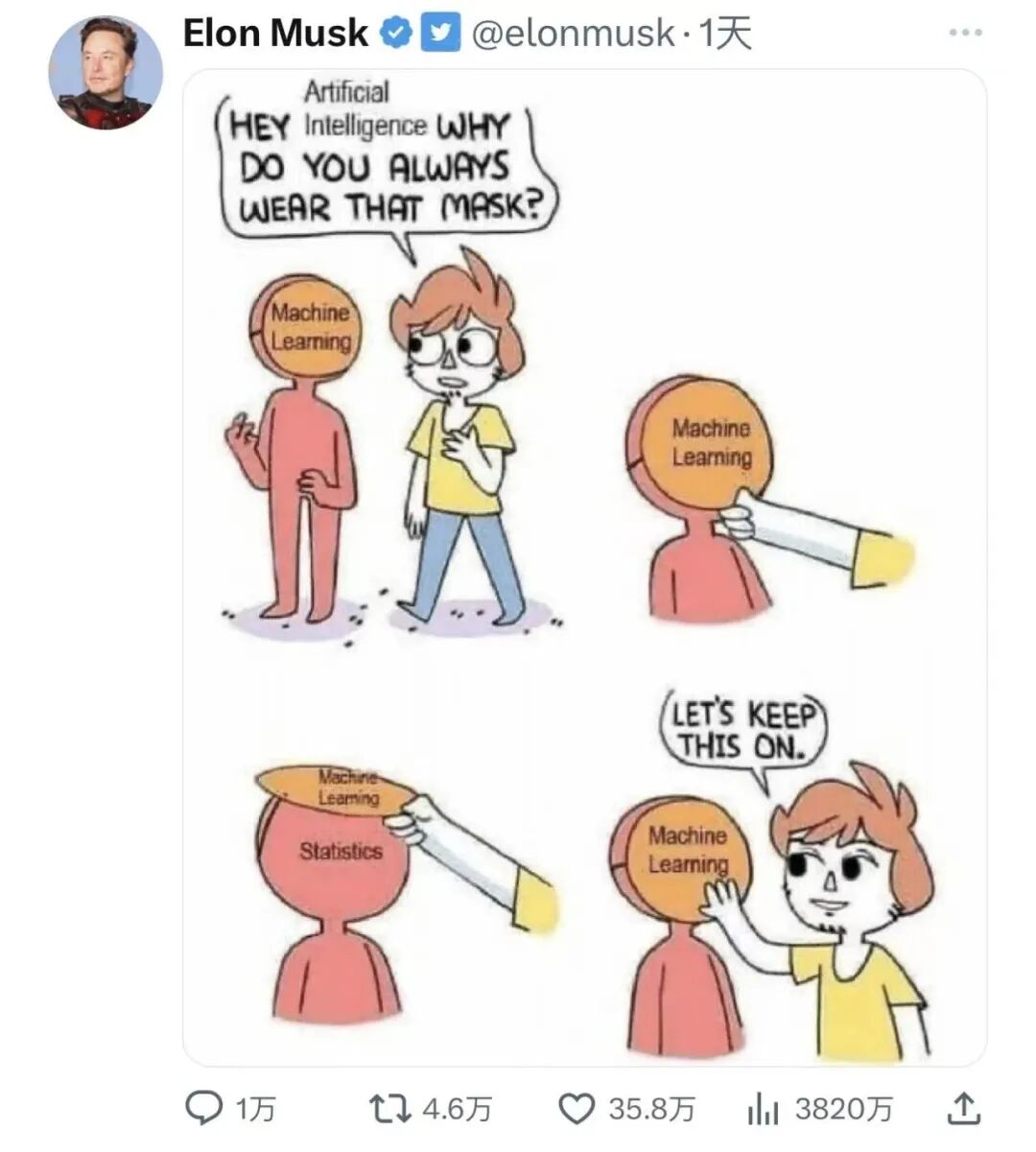 近日,特斯拉CEO和推特首席技术官(CTO)埃隆・马斯克近日在其个人推特上发布了一张图片,图片主题意在讽刺“人工智能”现状,并指出机器学习的本质就是统计。