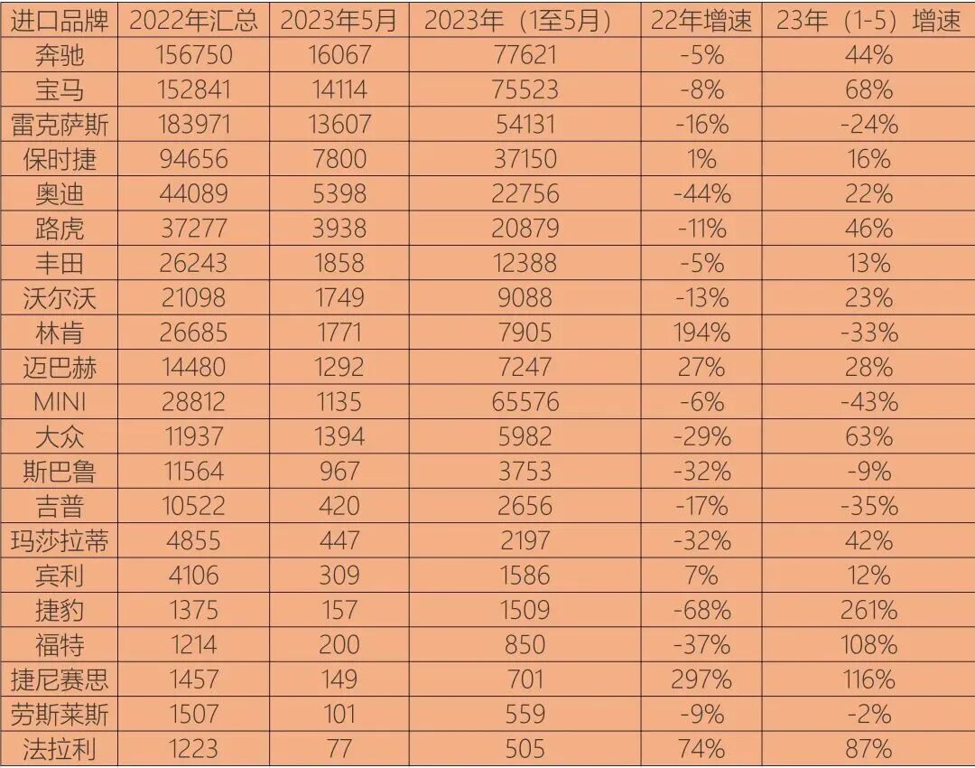 数据显示,2023年前五个月,雷克萨斯品牌的进口量同比下降了24%,其中ES车型下降了23%,RX车型更是直接下降了68%。此外,林肯品牌下降了33%,航海家车型下降了29%;MINI品牌下降了43%,MINI(非Countryman和Clubman)车型下降了40%。(界面)
