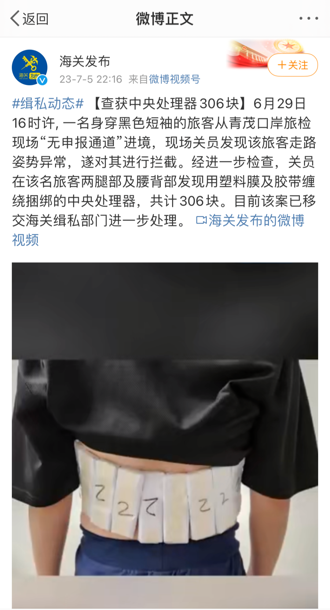 男子身绑 306 片 CPU 入境被查,因走路姿势明显异常