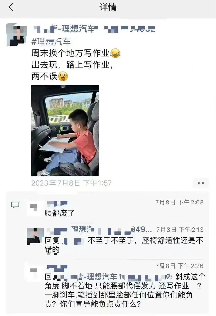 近日,一张疑似理想汽车销售发文宣传周末带娃出去玩,路上可以让孩子在车上写作业,随后被网友怒怼的截图在网上流传。