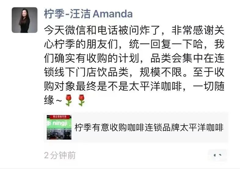 而到了傍晚,汪洁在微信朋友圈再次回应称,“我们确实有收购计划,品类会集中在连锁线下门店饮品类,规模不限。至于收购对象最终是不是太平洋咖啡,一切随缘。”8月21日晚,华润创业新闻发言人回应,不评论市场传闻。(南都湾财社)