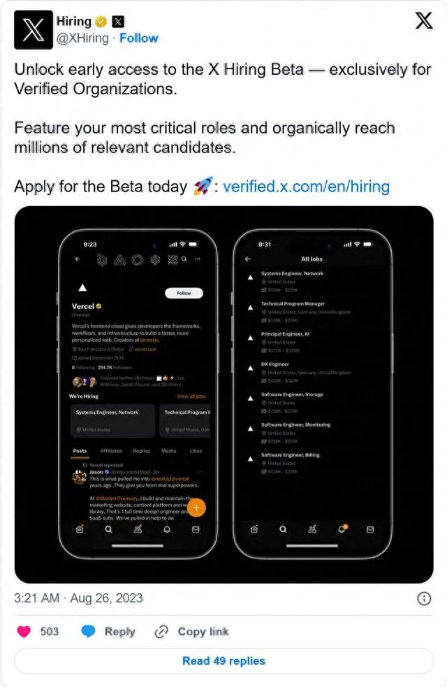 近日,𝕏(前身为 Twitter)公司新的 @Hiring 账户宣布正式推出 𝕏 Hiring 功能的测试版。已在 𝕏 上通过验证的感兴趣的组织可以申请加入测试版。虽然该功能还处于测试阶段,但平台上的一些账户似乎已经开始发布招聘信息。公告中的 Vercel 已经在其个人主页上发布了招聘信息。