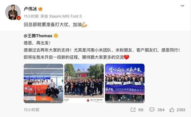 8月26日消息,王腾发微博称即将开启新的征程,卢伟冰的评论是回总部就要准备打大仗,证实了王腾重返小米总部的消息。