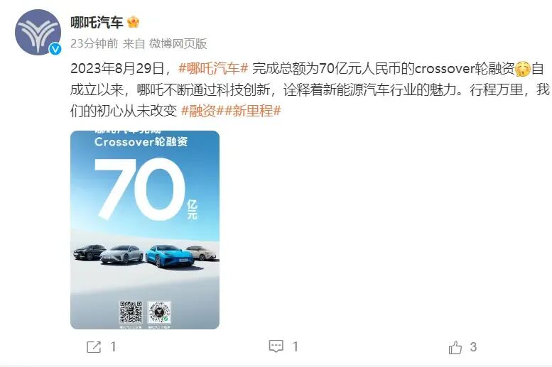 哪吒汽车宣布完成70亿元Crossover轮融资