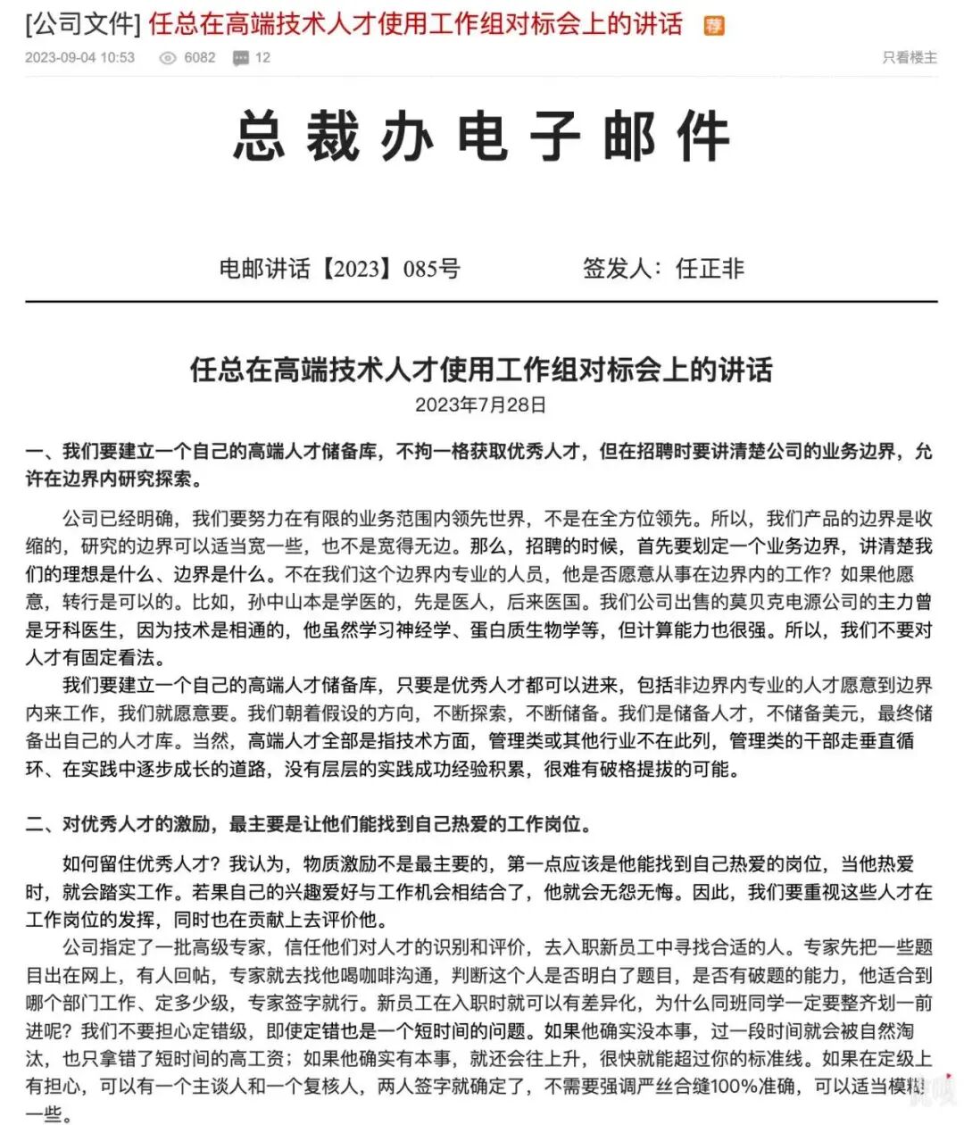 任正非称华为储备人才不储备美元,建立自己的高端人才储备库