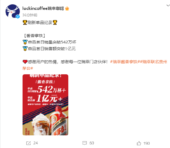 销售额突破1亿!瑞幸与茅台联名的酱香拿铁单日销量超542万杯