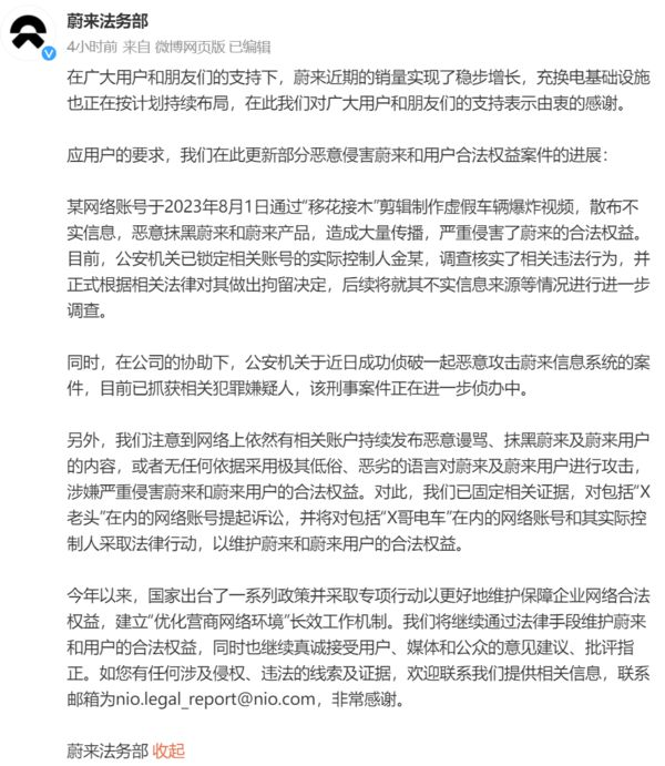 蔚来:已侦破恶意攻击信息系统案件,相关嫌疑人已抓获