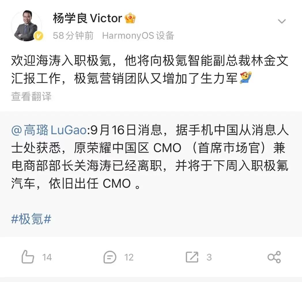 9月18日,吉利控股集团高级副总裁杨学良在其社交账号发文称,原荣耀中国区CMO兼电商部部长关海涛入职极氪,将向极氪智能副总裁林金文汇报。9月16日,有消息称,关海涛已经离职,并将于近期入职极氪汽车,依旧出任CMO。