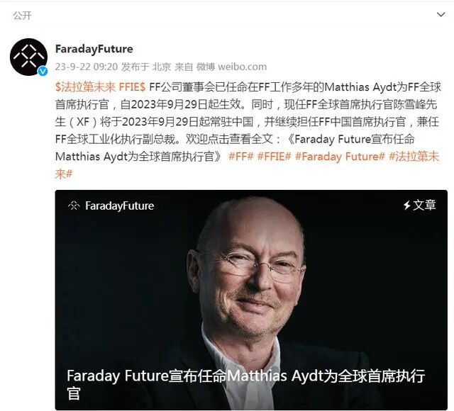 据法拉第未来官方微博,北京时间2023年9月22日(美国加州9月21日),法拉第未来(NASDAQ:FFIE)宣布,即将担任FF全球首席执行官的Matthias Aydt,FF创始人兼首席产品与生态系统官贾跃亭,现任全球首席执行官、即将担任全球工业化执行副总裁和中国区首席执行官的陈雪峰、代理首席财务官Jonathan Maroko和首席会计官韩韵,以及其他公司高管和管理层成员已自愿签署了一份薪资扣减和股票购买协议。