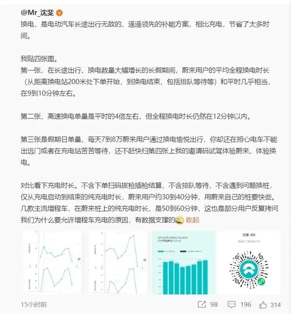 蔚来高管称增程车充电比纯电慢一倍,长途出行换电比充电更节省时间