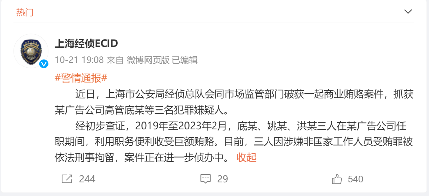贪污金额高达九位数?英国广告集团WPP上海办公室被查,三名高管被抓