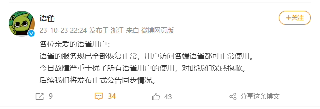 在经历了近 10 小时的故障之后,语雀服务现已全部恢复正常,各端语雀都可以正常访问,功能也恢复。不过,对于此次故障原因,官方暂未作说明。(IT之家)