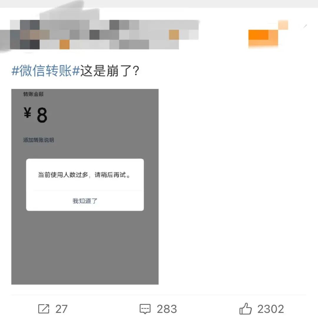 11月1日晚,多位网友反馈,微信支付以及语音通话等部分功能出现异常,例如微信转账时会提醒“当前使用人数过多,请稍后再试”。