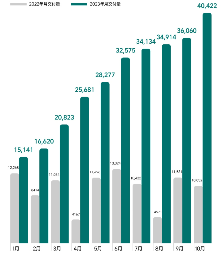 11月1日,理想汽车现公布了最新的 10 月交付数据。理想汽车本月共计交付新车 40,422 辆,同比增长 302.1%,月交付首次突破四万辆大关。截至 2023 年 10 月 31 日,理想汽车全年累计交付 284647 辆。