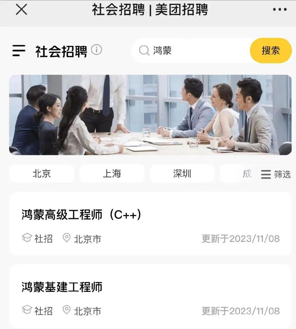 美团招聘官网更新了多个社招岗位,为鸿蒙原生应用开发招兵买马,主要开发美团鸿蒙App、大众点评鸿蒙App。招聘要求显示,具备鸿蒙研发经验者优先。