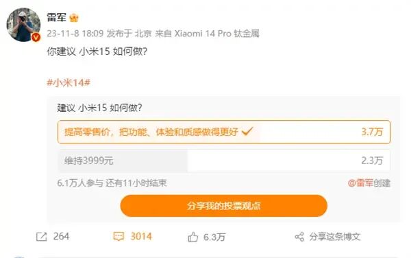 雷军微博调研小米15,超3万米粉建议提高零售价,把功能做更好
