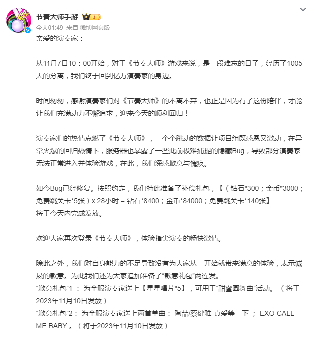 随后节奏大师手游官方微博发文向部分无法正常进入并体验游戏的玩家道歉,并公布补偿方案。官方表示,如今Bug已经修复,按照约定准备了补偿礼包,(钻石*300;金币*3000;免费跳关卡*5张)x28小时=钻石*8400;金币*84000;免费跳关卡*140张。