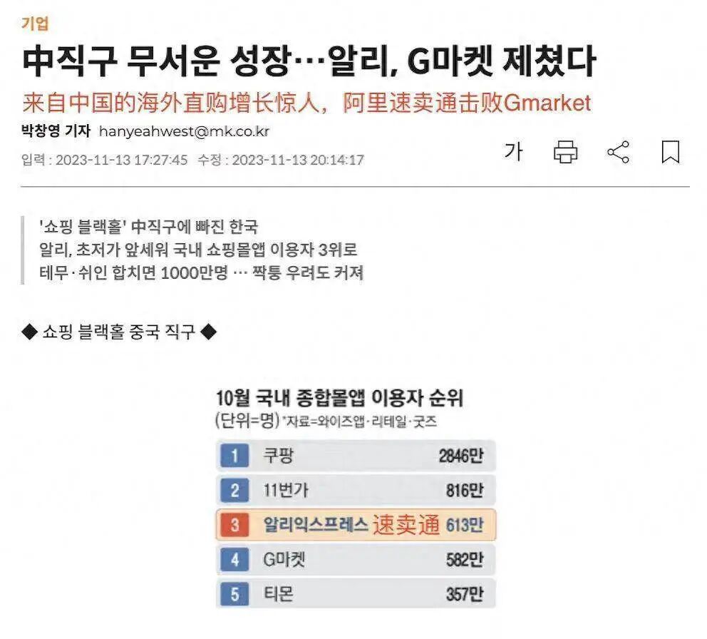 11月15日,据韩国应用软件分析服务商Wiseapp Retail Goods统计,速卖通10月韩国用户数飙升至613万人,超越韩国老牌购物网站GMarket,成为韩国第三大电商平台,这是韩国电商前三名中首次出现海外平台。