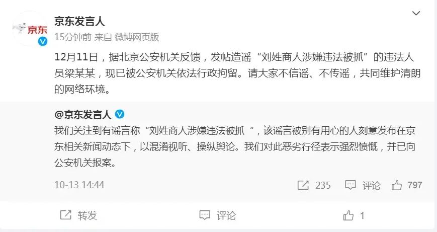 京东:发帖造谣“刘姓商人涉嫌违法被抓”者已被行拘