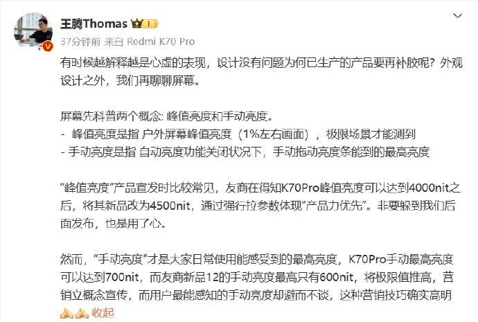 12月12日,Redmi市场总经理、Redmi品牌发言人王腾微博发文,科普屏幕峰值亮度和手动亮度。王腾表示,“峰值亮度”产品宣发时比较常见,友商在得知K70Pro峰值亮度可以达到4000nit之后,将其新品改为4500nit,通过强行拉参数体现“产品力优先”。