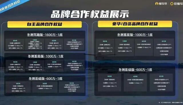 只有自主品牌有“冬测驾趣版”可选,价格为合作方案中最贵一档,1600万/席。至于“冬测蓄能版”和“冬测基础版”,价格分别为1000万和600万元每席,自主品牌和豪华、合资品牌的权益一致。对于上述合作权益的价格,懂车帝暂未回应。(潇湘晨报)