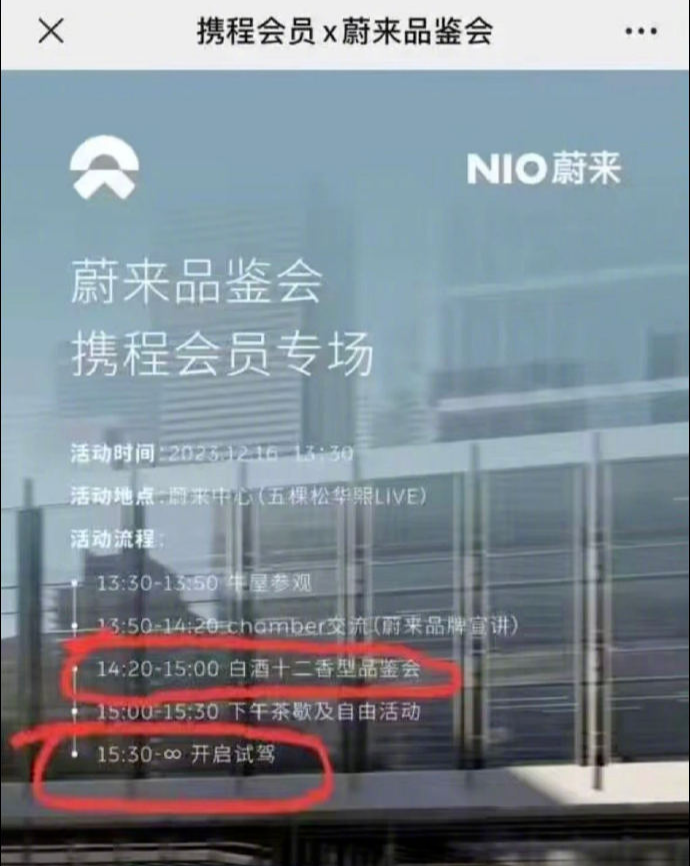 日前,蔚来门店品鉴会同时包含白酒品鉴和试驾环节引发争议。网络上流传的图片显示,携程与蔚来联合组织了一场品鉴会,时间是2023年12月16日下午,地点为位于五棵松华熙LIVE的蔚来中心。引发争议的是,此次品鉴会的流程中,同时包含了“白酒十二香型品鉴会”和“试驾”环节。