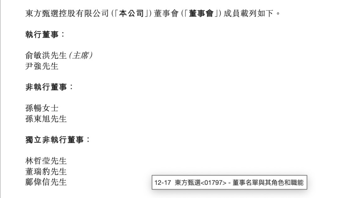 12月17日,东方甄选在港交所公告,董事会已于12月16日议决解除孙东旭的行政总裁一职,并罢免其公司执行董事职务,即时生效。俞敏洪表示,免去孙东旭CEO的岗位,与董宇辉没有关系,是管理失误导致事情越来越大。孙东旭不再担任东方甄选CEO,但也会以自己的方式为东方甄选继续做自己的贡献。