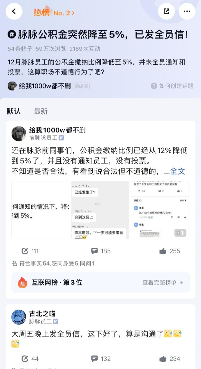 脉脉取消早晚餐饭补福利,将公积金缴纳比例从12%下降到5%