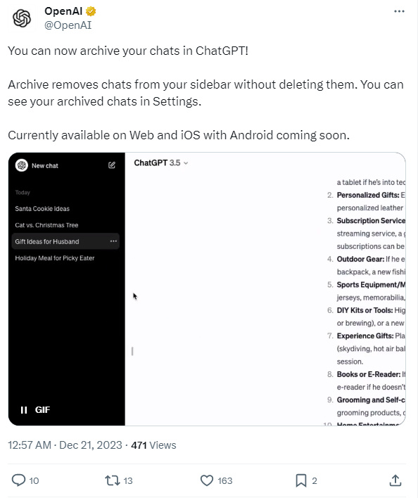 OpenAI推出聊天内容存档功能