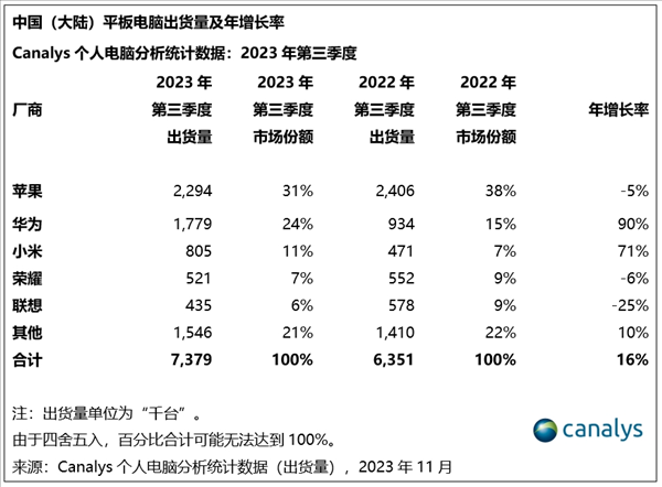 12月21日消息,Canalys发布的最新数据显示,2023年第三季度,中国大陆平板电脑市场同比增长16%。其中,华为平板年增长率高达90%,该季度出货量稳居中国品牌第一。苹果的市场份额从38%下降到31%,同比下滑5%。华为的市场份额从去年同期的15%增至24%,增幅高达90%。