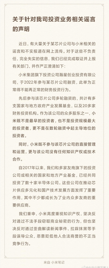 知情人士透露,该侵权公司或为尊湃通讯,权利公司则是华为全资持股公司上海海思技术有限公司。案件中提到张某应该就是尊湃通讯创始人兼CEO张琨,另据其身边人士指出,张琨已失联数月。12月24日晚,小米集团官方发表声明,针对网上流传的“尊湃公司抄袭偷窃华为芯片机密案件”进行了回应:小米既不参与该芯片公司的直接管理和运营,更与该公司没有任何知识产权或技术合作。