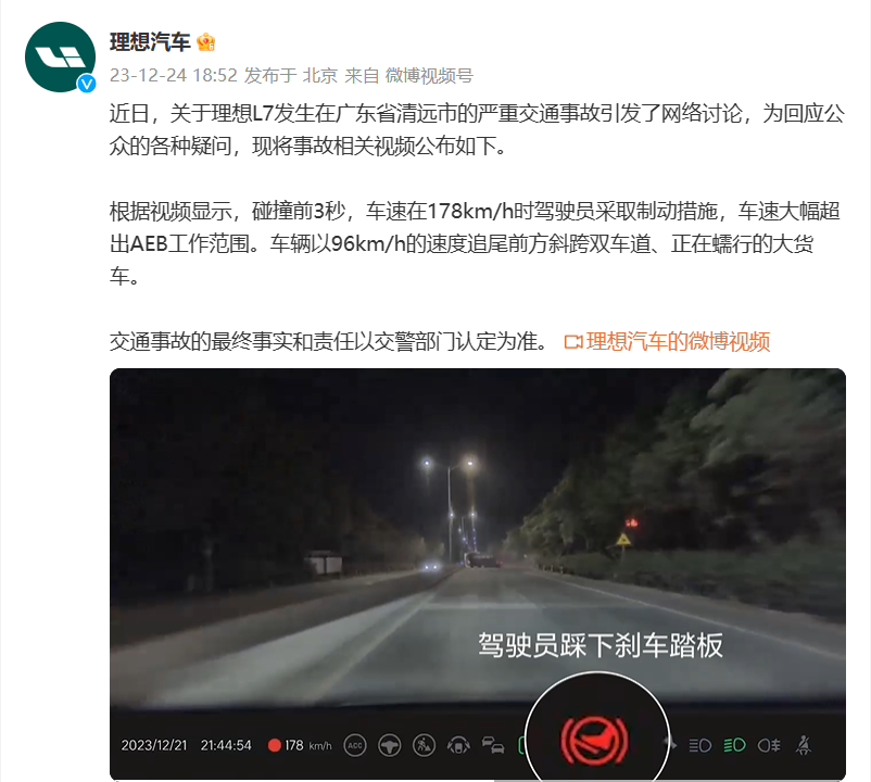 理想汽车公布广东清远L7交通事故相关视频,车速大幅超出AEB工作范围