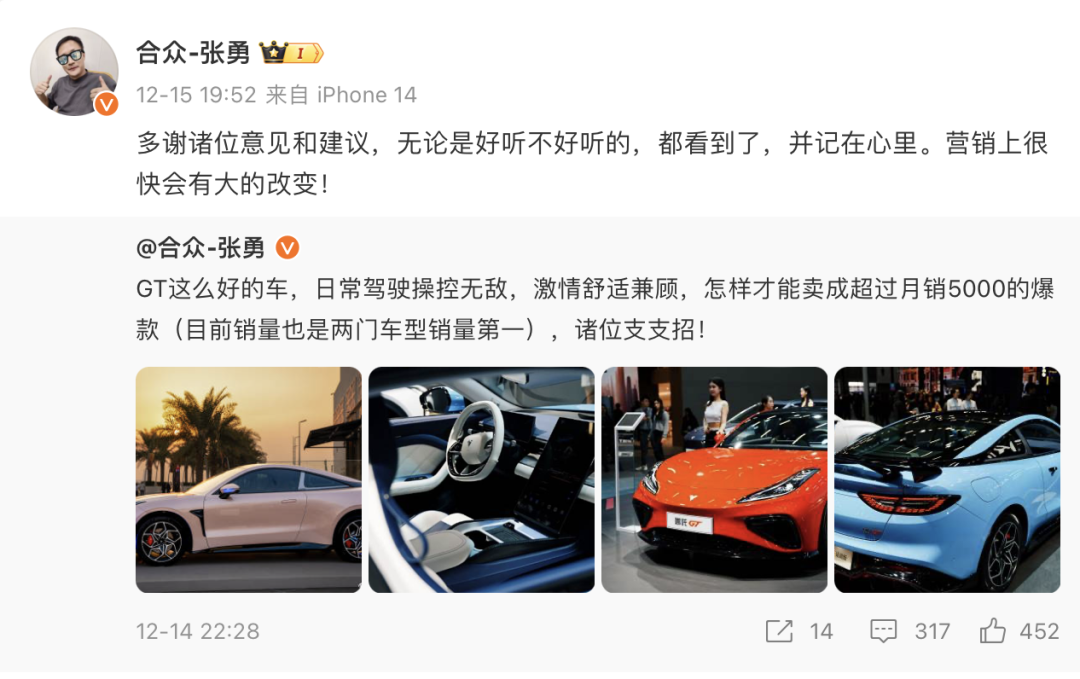 今年1月至11月,哪吒汽车累计交付新车12.24万辆,同比下滑15.19%,25万辆的年度目标完成不足一半,其中11月单月销量仅为12506辆,下滑超17%。从“年度销冠”跌落到新势力“副班长”,哪吒只用了不到1年的时间。惨淡的销量使得哪吒汽车首席执行官张勇在微博求网友"支招",直言“营销系统对不起研发团队的努力”。