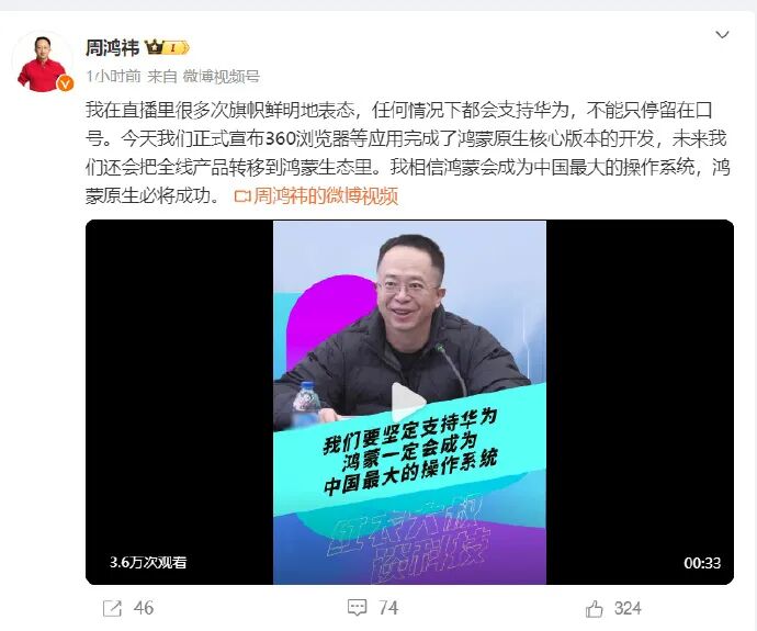 12月27日,360集团创始人、董事长@周鸿祎 发文称:“我在直播里很多次旗帜鲜明地表态,任何情况下都会支持华为,不能只停留在口号。