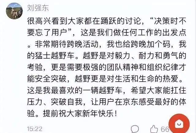 此前消息,有京东员工在内网讨论跨年晚会方案时,刘强东在留言区表示:“决策时不要忘了用户”,这是我们做任何工作的出发点。他表示,自己将拿出自己最喜欢的一辆猛士越野车,作为湖南卫视跨年晚会的互动奖品之一,为晚会加码助力。(新浪科技)