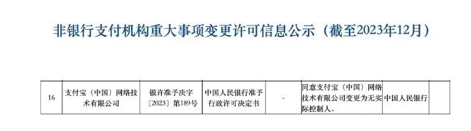 央行2023年12月30日披露行政许可信息,同意支付宝(中国)网络技术有限公司变更为“无实际控制人”。支付宝全资持股公司蚂蚁集团2023年1月曾发布公告称,拟对股东上层结构进行调整,调整后将由“马云先生为蚂蚁集团实际控制人”变更为“不再存在任何直接或间接股东单一或共同控制蚂蚁集团的情形”。