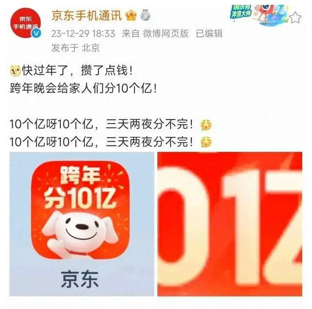 2023年12月29日,京东发布消息称,北京市高级人民法院对京东诉浙江天猫网络有限公司、浙江天猫技术有限公司、阿里巴巴集团控股有限公司“二选一”案做出一审判决,认定其滥用市场支配地位实施“二选一”的垄断行为成立,对京东造成严重损害,并判决向京东赔偿10亿元。随后京东便上线了“跨年分十亿”活动,有网友调侃:“合着拿阿里的赔款犒劳大家伙儿是吧,东哥好样的!”