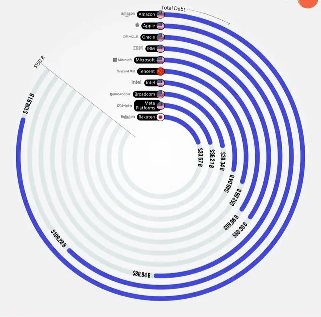 近日,数据研究机构BusinessFinancing.co.uk分享了近一年各大公司的债务状况。在科技公司TOP10负债榜上,亚马逊以1389.1亿美元(近1万亿元人民币)高居榜首,而苹果紧随其后,以1092.8亿美元(约7861亿元人民币)的负债总额位列第二。位居第三到第十的依次为甲骨文、IBM、微软、腾讯、英特尔、博通、Meta和rakuten。