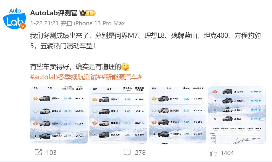 在懂车帝冬测结果引发热议后,同样为汽车媒体的“AutoLab”宣布将就当前五款热门的混动车型进行冬测,近日测试结果出炉。据悉,此次一共有问界M7、理想L8、魏牌蓝山、坦克400、方程豹豹5参与,测试的项目包括纯电电耗测试、亏电油耗测试、混动综合油耗测试和极寒环境空调制热效率测试四大项目,基本涵盖了极寒天气的用车场景。